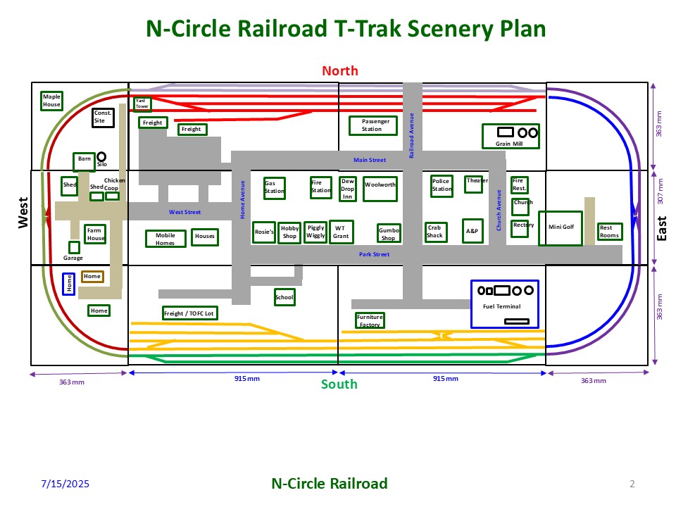 | N-Circle Railroad Layout Diagram and Scenery Plan | Graphic | Ron Piro | Updated 7/17/2025 | Track plan and scenery diagram for the N-Circle Railroad layout. |
