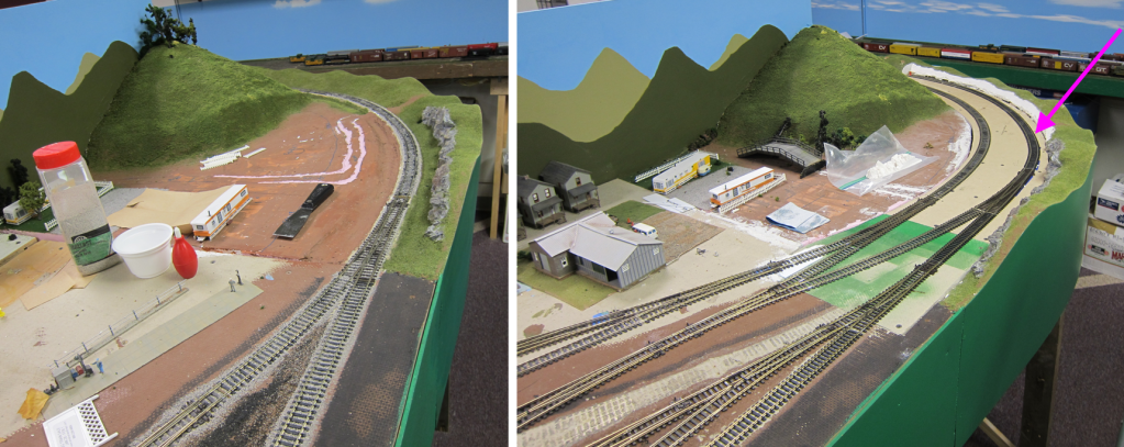 Note the light-colored sub-roadbed in the “After” shot above showing where the original track alignment was located with the shorter yard tracks. The arrow shows the new track added to the mainline.
