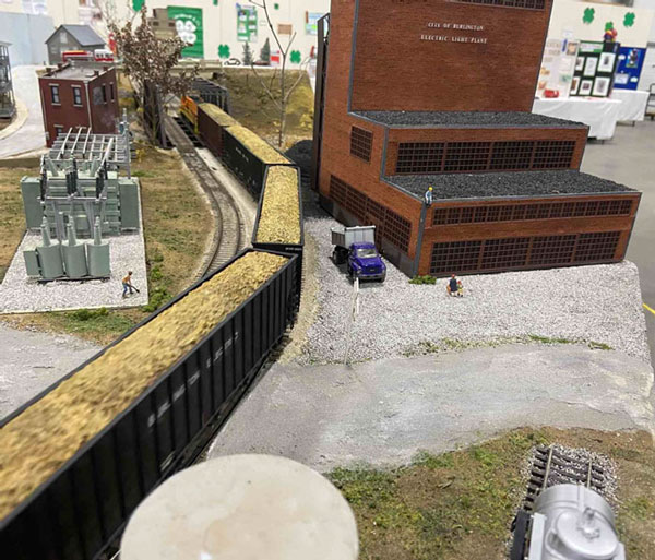 The wood chip train passing by the old Burlington waterfront Electric Light Plant.