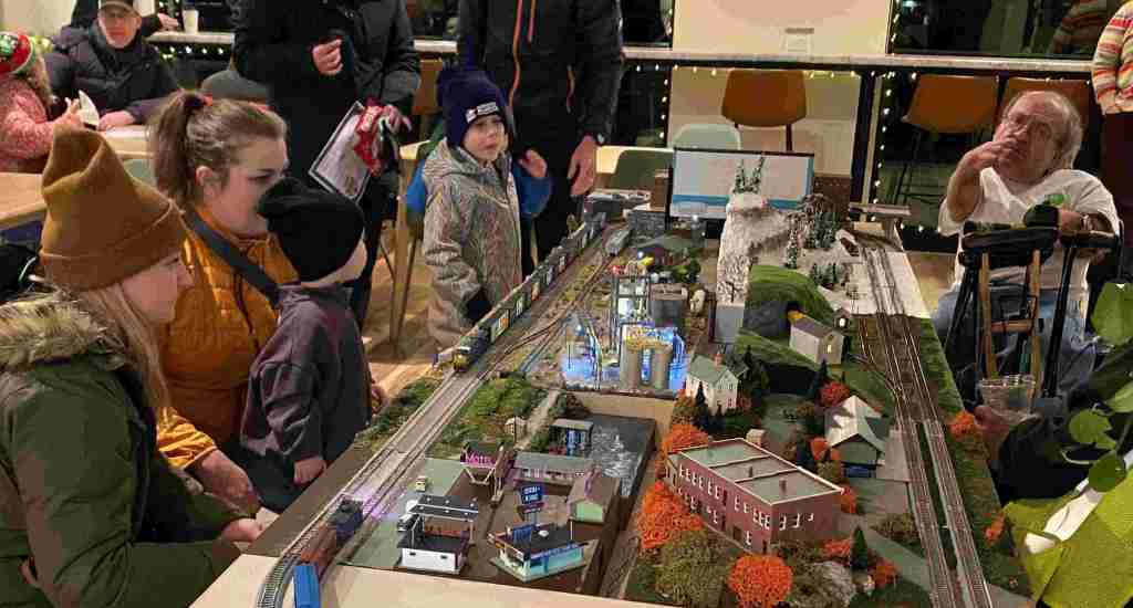 Young train enthusiasts enjoy the NWV’s new N-scale T-Trak modular layout on display at the Box Car Bakery on December 8, 2023 for the Essex Train Hop!